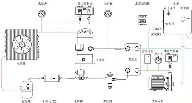 根據(jù)制冷系統(tǒng)原理,低溫低壓的液態(tài)冷媒在蒸發(fā)器里面與周圍水進行熱交換蒸發(fā)器吸收水的熱量,蒸發(fā)成低溫低壓的氣態(tài),蒸發(fā)過程中冷媒溫度不變,低溫低壓氣態(tài)的冷媒進入到壓縮機,經(jīng)壓縮機壓縮,被壓縮成高溫高壓的氣態(tài),然后進入冷凝器,在冷凝器里與室內(nèi)的介質(zhì)進行熱交換,高溫高壓的氣態(tài)的部份熱量被介質(zhì)吸收,介質(zhì)溫度升高,冷媒放熱冷凝器變成高溫高壓液態(tài),冷凝器過程溫度不變,然后進入膨脹閥進行節(jié)流,節(jié)流是迅速降溫的過程,冷媒變成低溫低壓的液態(tài),此過程后的冷媒再進入到蒸發(fā)器進行換熱蒸發(fā),從而實現(xiàn)制冷系統(tǒng)的整個過程,這種循環(huán)是連續(xù)進行的,水才得以連續(xù)不斷的制冷。