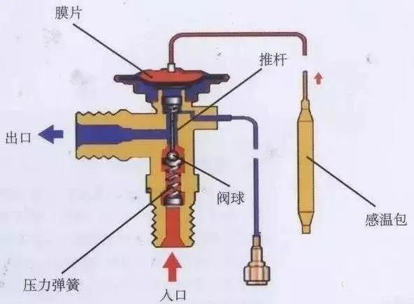 起節(jié)流降壓的作用,經(jīng)冷凝器冷凝后的高壓制冷劑液體經(jīng)過節(jié)流閥時,因受阻而使壓力下降,導(dǎo)致部分制冷劑液體汽化,同時吸收氣化潛熱,其本身溫度也相應(yīng)降低,最為低溫低壓的濕蒸汽,然后進(jìn)入蒸發(fā)器。