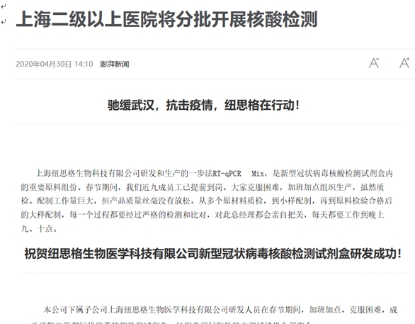 我司戰(zhàn)略合作伙伴紐思格生物充分發(fā)揮企業(yè)的優(yōu)勢,積極響應(yīng)人民需求,在疫情爆發(fā)初期就不計成本,不計付出投入各種酶、Master Mix和核酸提取試劑的生產(chǎn)研發(fā),經(jīng)過全體員工夜以繼日的努力,紐思格于2月7日宣布新型冠狀病毒核酸檢測試劑盒研發(fā)成功,為抗擊疫情奉獻(xiàn)綿薄之力。