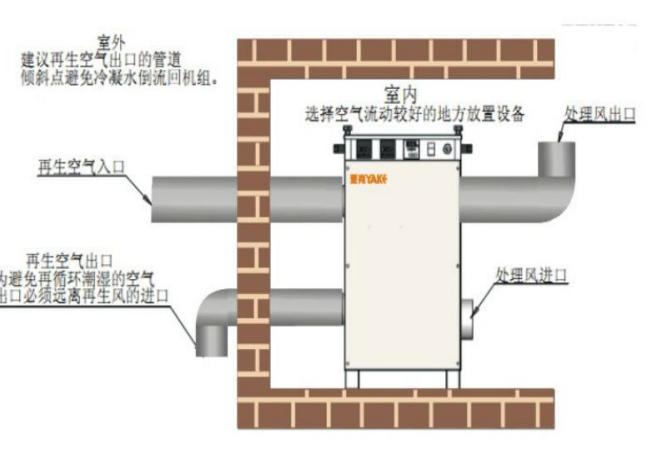 除濕機置于室內(nèi):再生風(fēng)進口和再生空氣岀口管道必須要置在外界環(huán)境。干空氣必須散布在除濕房間 內(nèi),處理風(fēng)進口不需要連接C