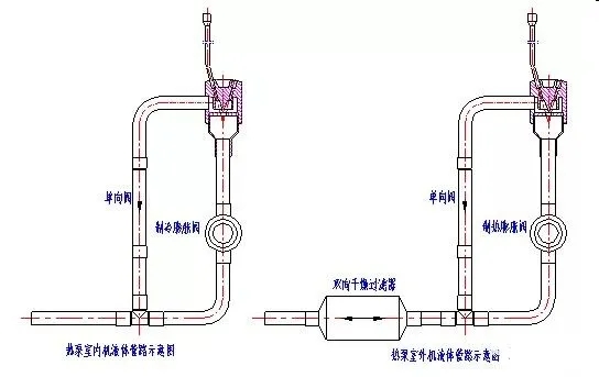 圖示翅片盤(pán)管作冷凝器使用時(shí),冷凝液體直接通過(guò)單向閥,不通過(guò)圖中毛細(xì)管;作蒸發(fā)器用時(shí),制冷劑經(jīng)過(guò)主毛細(xì)管一次節(jié)流后,再由分流毛細(xì)管分流。
