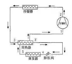 同時(shí)也加熱了回氣管的溫度,避免壓縮機(jī)吸入過潮蒸汽而可能產(chǎn)生液擊。毛細(xì)管節(jié)流的系統(tǒng),毛細(xì)管與回氣管(吸氣管)合并在一起走,有合焊在一起的(大金VRV就是采用的此種方法),有用熱膠套套在一起的,有從回氣管中穿過的,還有纏繞在回氣管上的,也有的將毛細(xì)管或供液管直接在箱體內(nèi)通過。毛細(xì)管與回氣管進(jìn)行熱交換,使節(jié)流前的液態(tài)制冷劑與回氣管道中的低溫制冷劑蒸汽進(jìn)行熱交換冷卻而得到過冷,這樣既可減少回氣管路中可能夾帶的液體液擊壓縮機(jī),同時(shí)又能達(dá)到節(jié)流前液體制冷劑過冷的目的。當(dāng)然還有采用回?zé)崞鞯?,原理也是一樣,請參見下圖:
