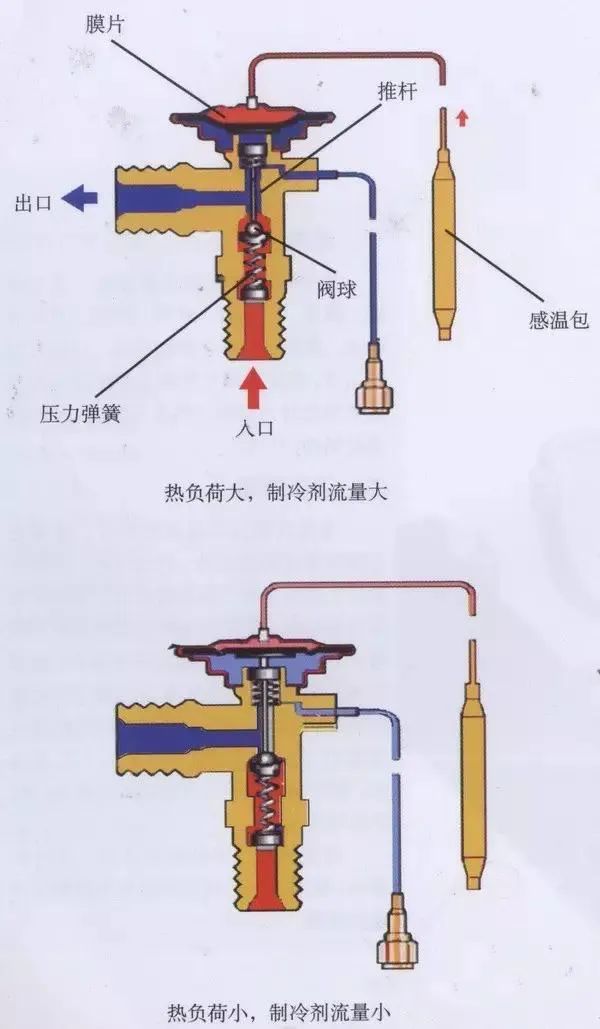工作時,固定在蒸發(fā)器出口管道上的感溫包感應(yīng)蒸發(fā)器出口的過熱溫度,使感溫包內(nèi)產(chǎn)生壓力,并由毛細(xì)管傳到膜片上部的空間,在壓力的作用下膜片以彈性變形的方式把信號傳遞給頂針(執(zhí)行機(jī)構(gòu)),從而調(diào)節(jié)閥們的開度,控制制冷劑的流量。