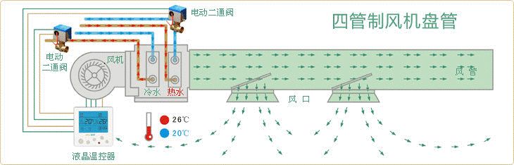 四管制空調指空調箱同時裝有冷盤管和熱盤管,每組盤管一進一回,共四根,所以叫四管制。兩組水管分別接入冷水和熱水,也就是一年四季不管什么時候,制冷制熱都可以隨時切換,可以實現一些房間供熱的同時,另一些房間供冷。并且配合末端設備能夠實現室內溫度和濕度精確控制的要求;由于冷水和熱水在管路和末端設備中完全分離,有助于系統(tǒng)的穩(wěn)定運行和減小設備的腐蝕;所以它的標準高,成本也高。所以全年運行過程中,供冷和供熱工況頻繁交替轉換或需同時使用的空氣調節(jié)系統(tǒng),宜采用四管制水系統(tǒng)。它較適合于內區(qū)較大,或建筑空調使用標準較高且投資允許的建筑中。
