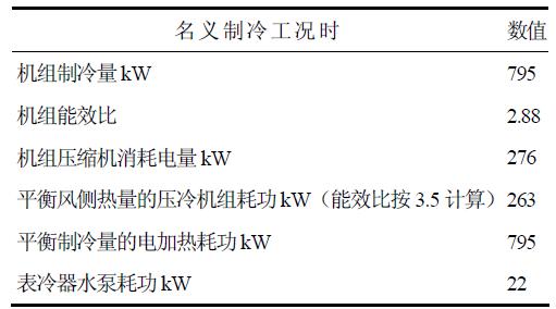 該測試系統(tǒng)在測試時,運用表冷器能夠使得冷熱量自平衡,最大限度地利用風(fēng)冷冷(熱)水機組使用側(cè)的冷量與熱源側(cè)的熱量交換,熱源側(cè)的熱量被使用側(cè)的冷量平衡后剩余的只有壓縮機的功率這部分熱量需要通過冷卻設(shè)備散去,并不需要消耗大量的能量來單獨平衡使用側(cè)產(chǎn)生的冷量和熱源側(cè)產(chǎn)生的熱量。而且風(fēng)冷冷(熱)水機組的能效比越高,同等制冷量下,需要測試系統(tǒng)散去的壓縮機功率也就越少,測試系統(tǒng)也越節(jié)能。以800kW風(fēng)冷冷(熱)水機組制冷為例,表冷器的運用對測試系統(tǒng)的耗能比較見表1。